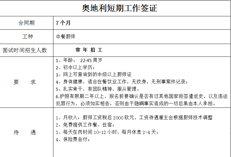 奧地利廚師-短期簽證
